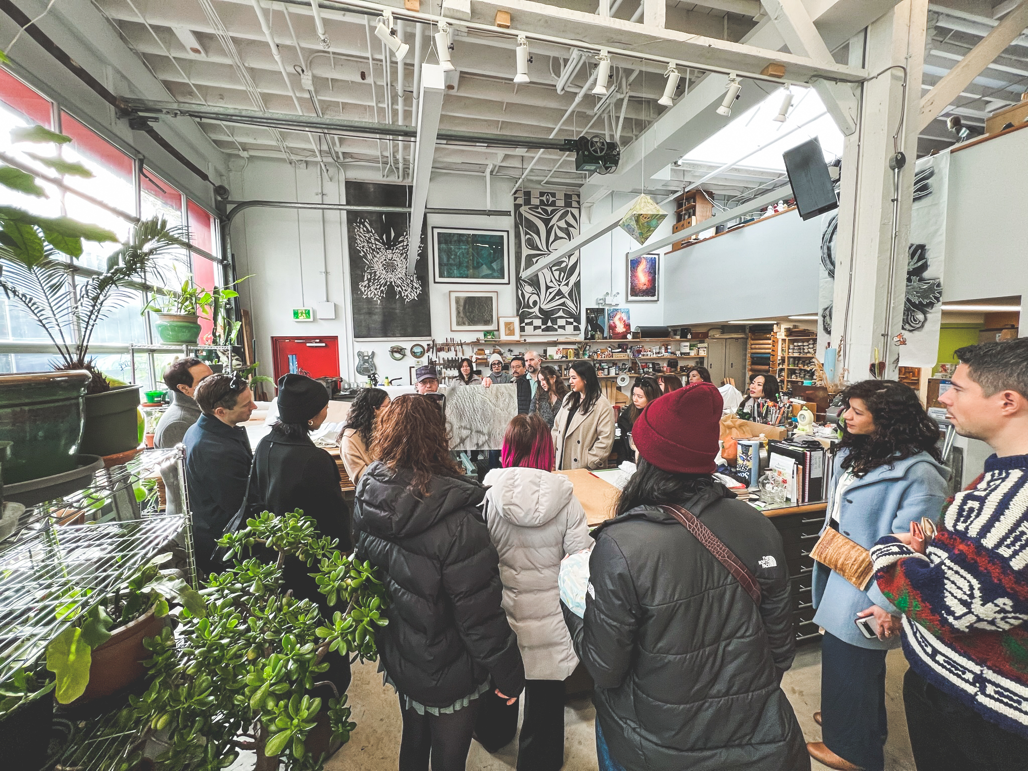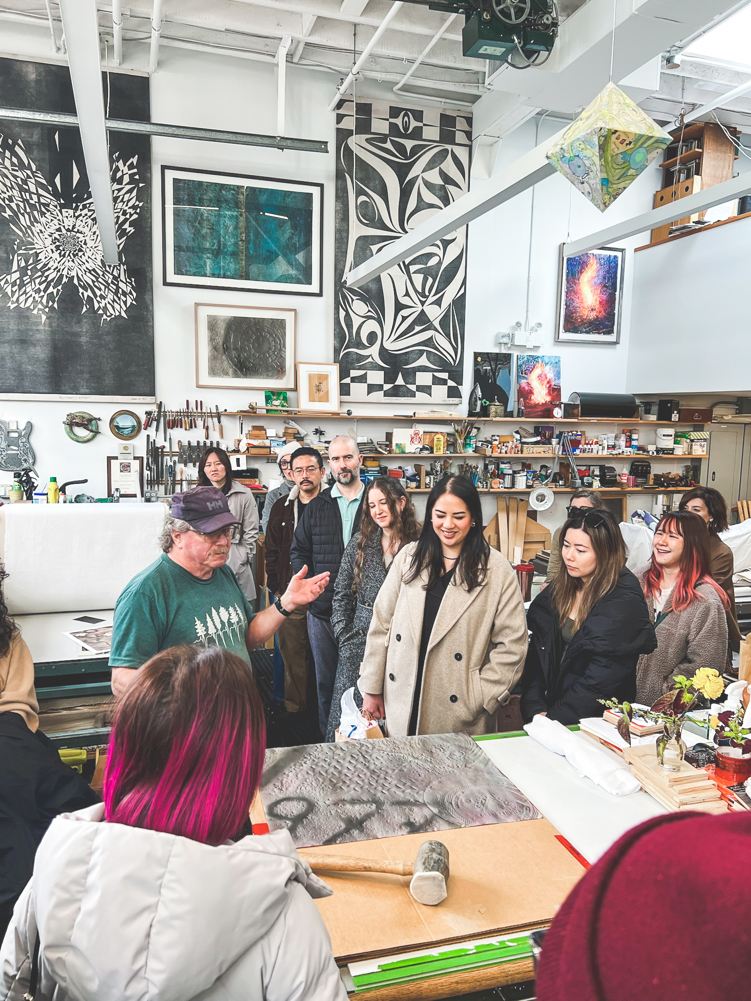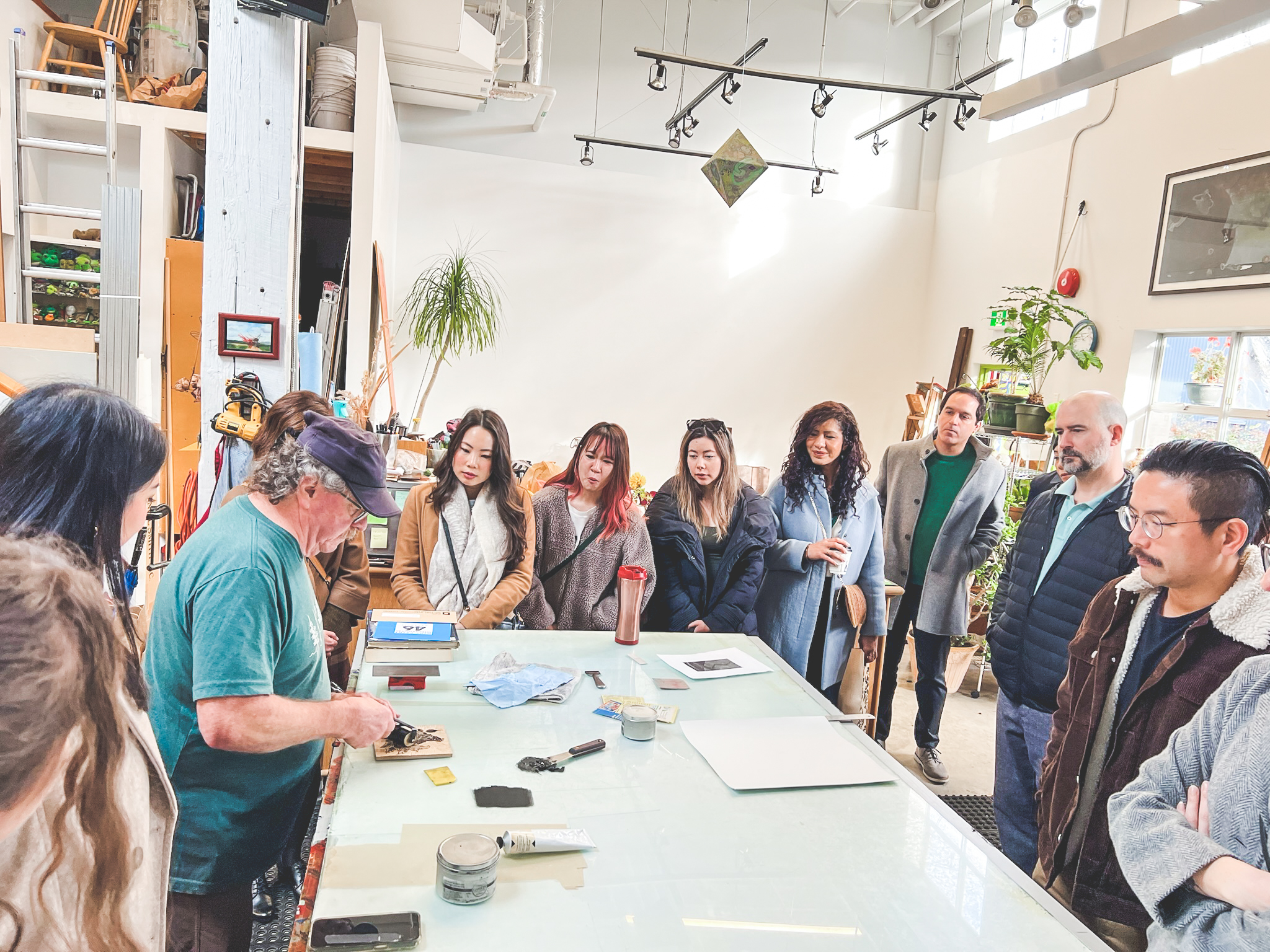 We began with a hands-on introduction to printmaking, learning about different techniques directly from Peter, a master printmaker at his studio New Leaf Editions. These kinds of visits open up layers of understanding — not just how work is made, but who is behind it. The experience was personal, generous, and deeply human, the kind that stays with you long after you leave the studio.